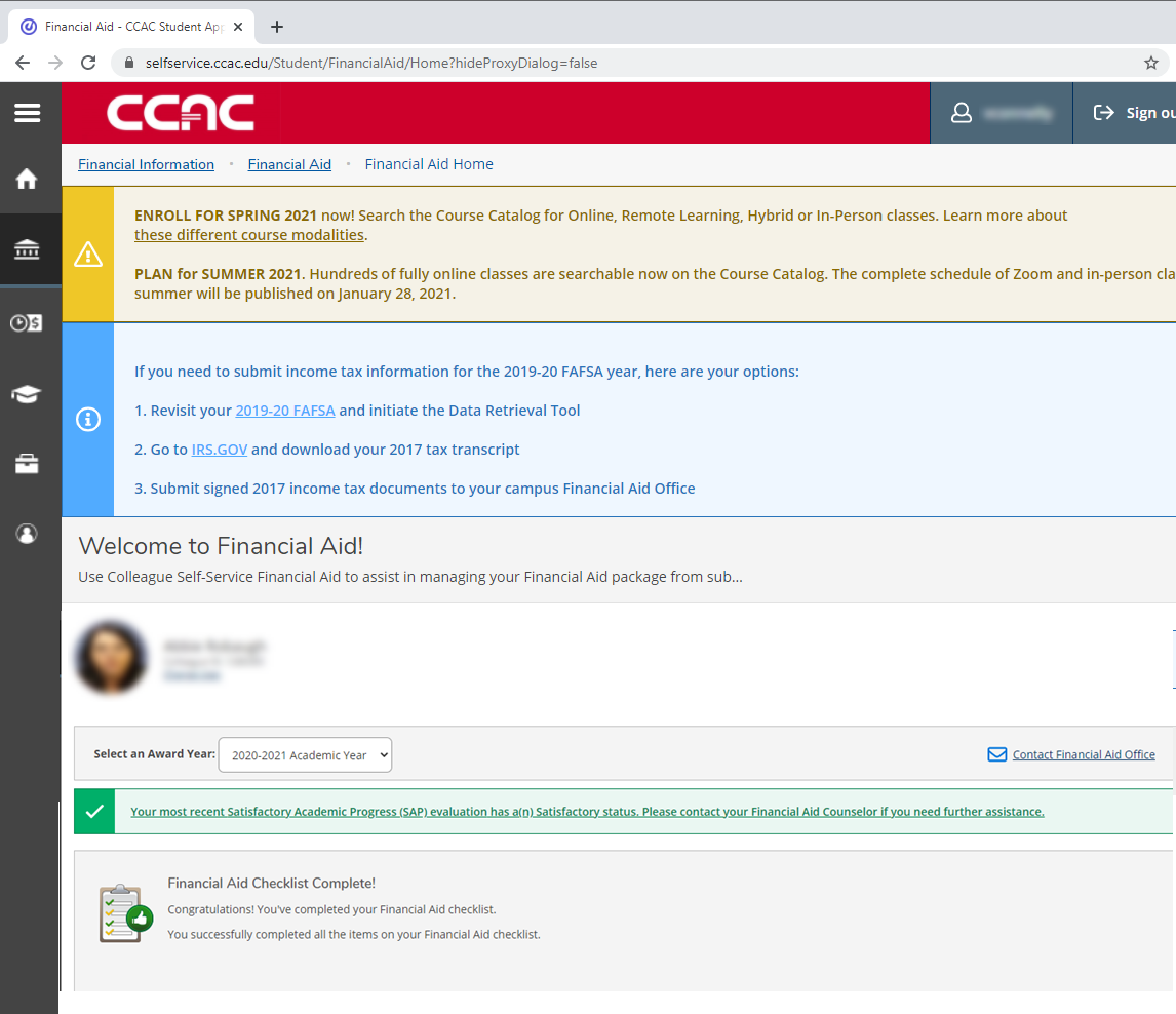 To learn more about the areas on the Financial Aid Status Page in CCAC Self-Service, click here